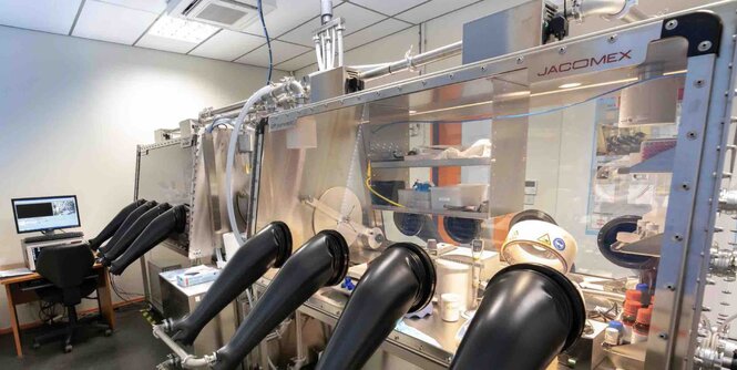 The electrical characteristics of organic solar cells can be measured either under darkness or under illumination, using a solar simulator connected to one of the glove-boxes and dedicated sample holders.