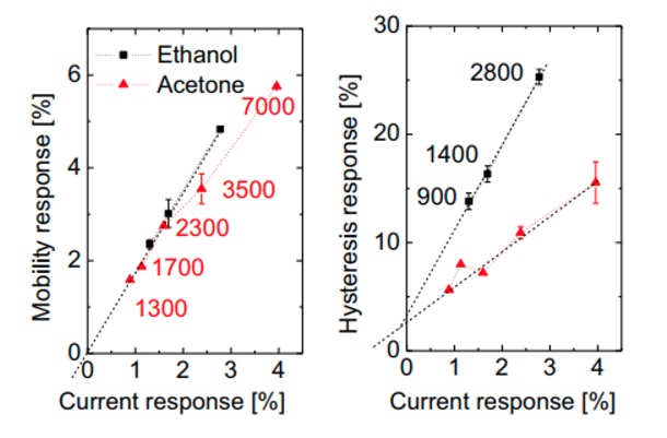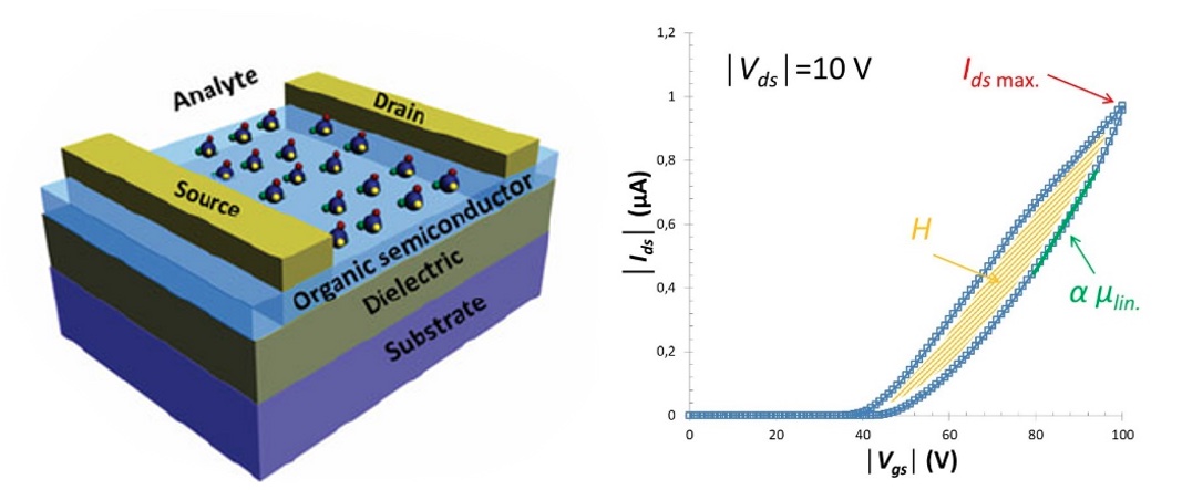 Certain electrical characteristics of O-FETs vary when exposed to analytes and analysis of these variations can ideally lead to the type of analyte and its concentration. Examples of analyte-sensitive electrical characteristics are maximum drain-source current (Ids max.), charge-carrier mobility (µ) or hysteresis (H).